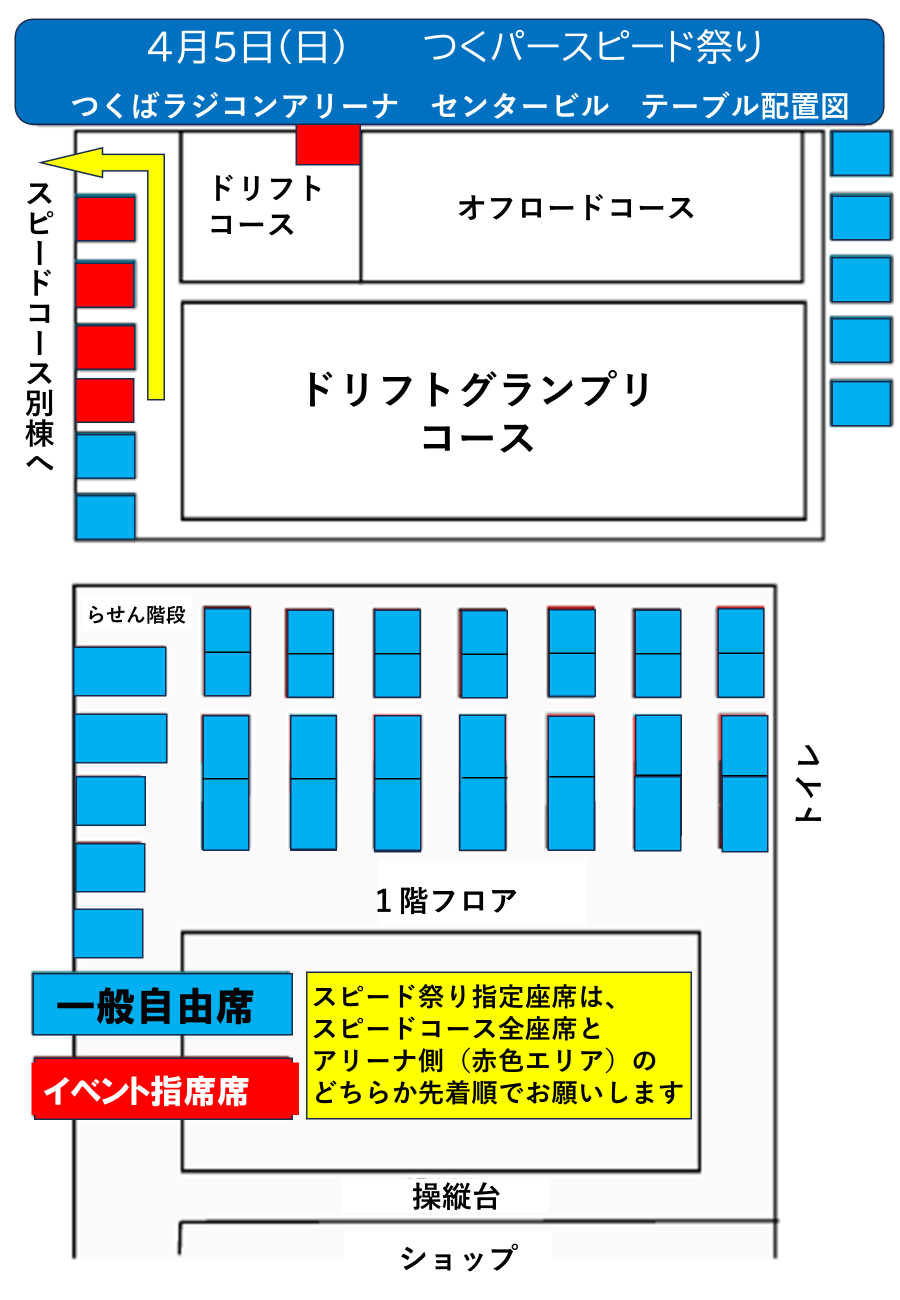 座席については、スピードコース棟全席と、アリーナ棟のスピードコースに近い側になります。 どちらか選択のうえ先着順となりますので、宜しくお願いします。